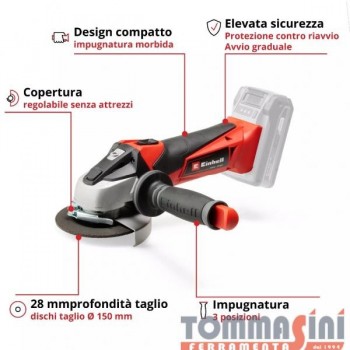 - Menmbro della famiglia Power X-Change - La più leggera della sua classe - Avvio softstart per maggiore sicurezza dell'operatore - Protezione da sovraccarico - Prese d'aria ottimizzate per ideale raffreddamento e lunga vita del prodotto - Funzionamento silenzioso grazie al disaccoppiamento motore / mandrino - Copri disco con regolazione manuale - Robusti ingranaggi in alluminio - Impugnatura aggiuntiva posizionabile su 3 posizioni - Design ergonomico e compatto con superfici softgrip - Per risultati ottimali consigliata batteria da 2,6 Ah in su - Fornito senza batterie e caricabatterie (acquistabili separatamente) - Disco non incluso